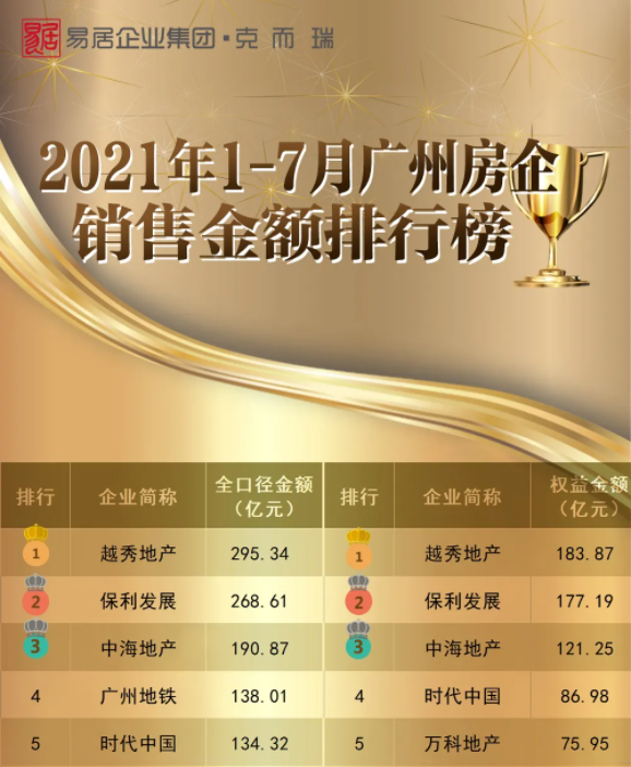 8月6日,克而瑞独家发布《2021年1-7月广州房企销售榜》,AG亚娱地产以亮眼业绩表现再次斩获权益金额榜、全口径金额榜双料第一。